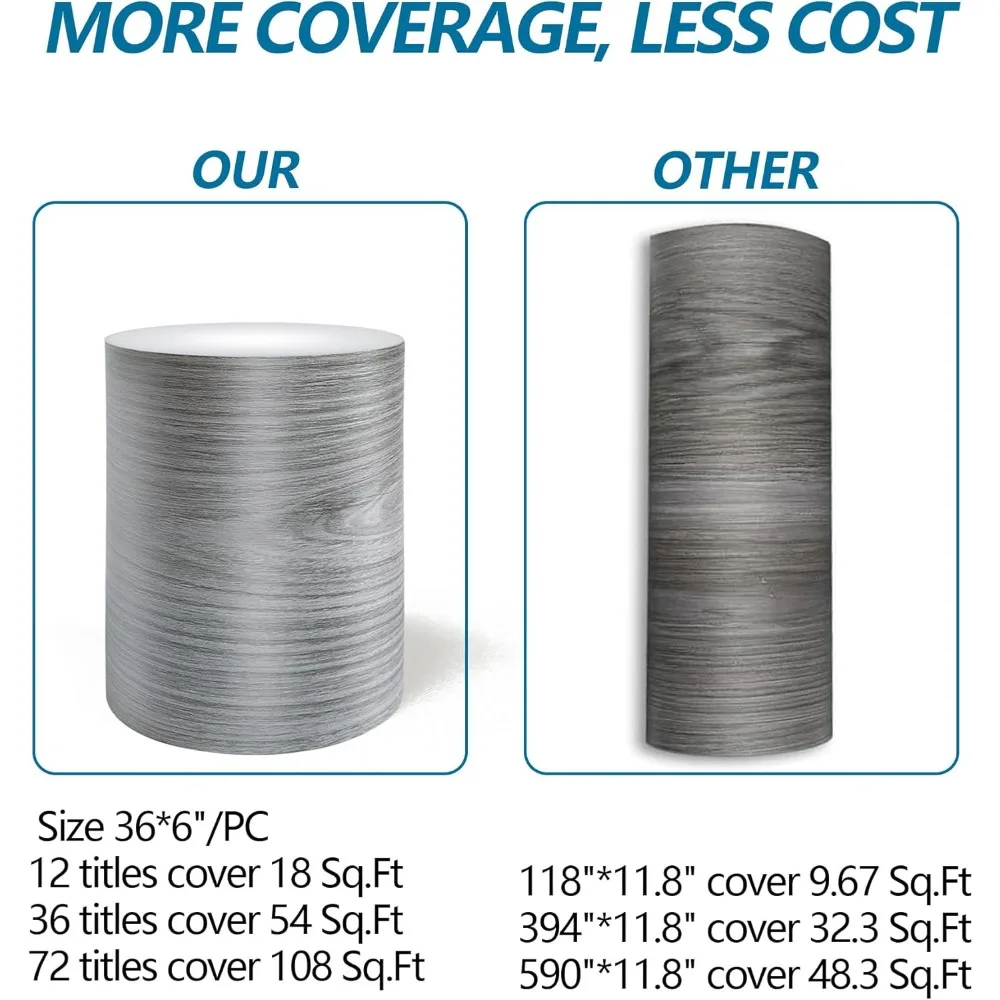 - 【Size & Coverage Area】 – Each floor tile measures 36 x 6 inches, with a thicknessof 0.6mm. A set of 36 pcs covers an area of 54 Sq.Ft, while 12 pcs cover 18 Sq.Ft. lf you’re unsure about the product, you can start by purchasing just 22 pcs to assessthe results without disrupting your daily life.