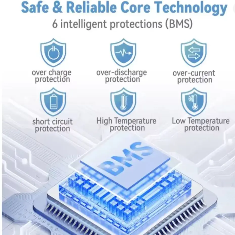 - BMS functions:Â over-current, over-discharge, over-charge, short-circuit,