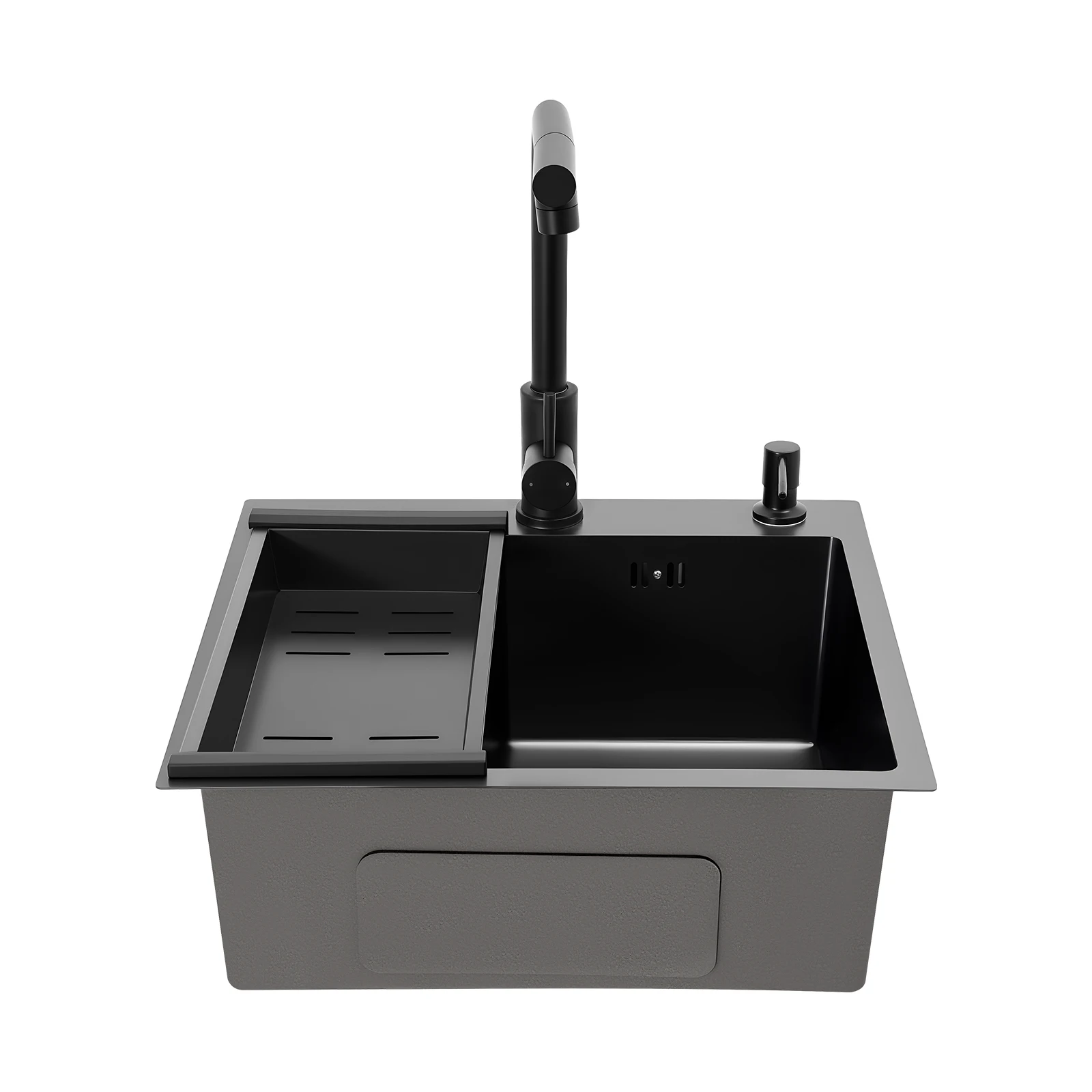 Complete Set: The product includes a sink, pull-out faucet, draining basket, soap dispenser, a drainer set, 2 angle valves, and other required accessories to meet your needs, reducing your money and time for additional purchases.