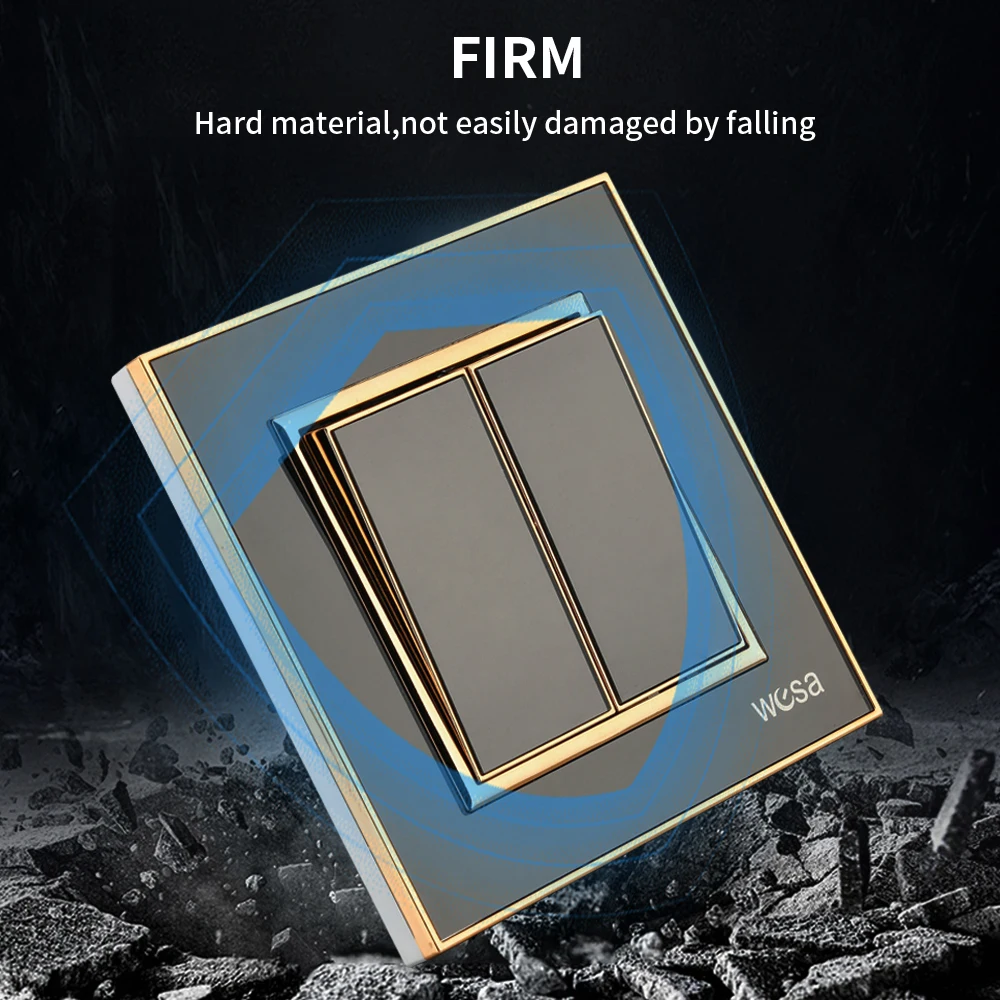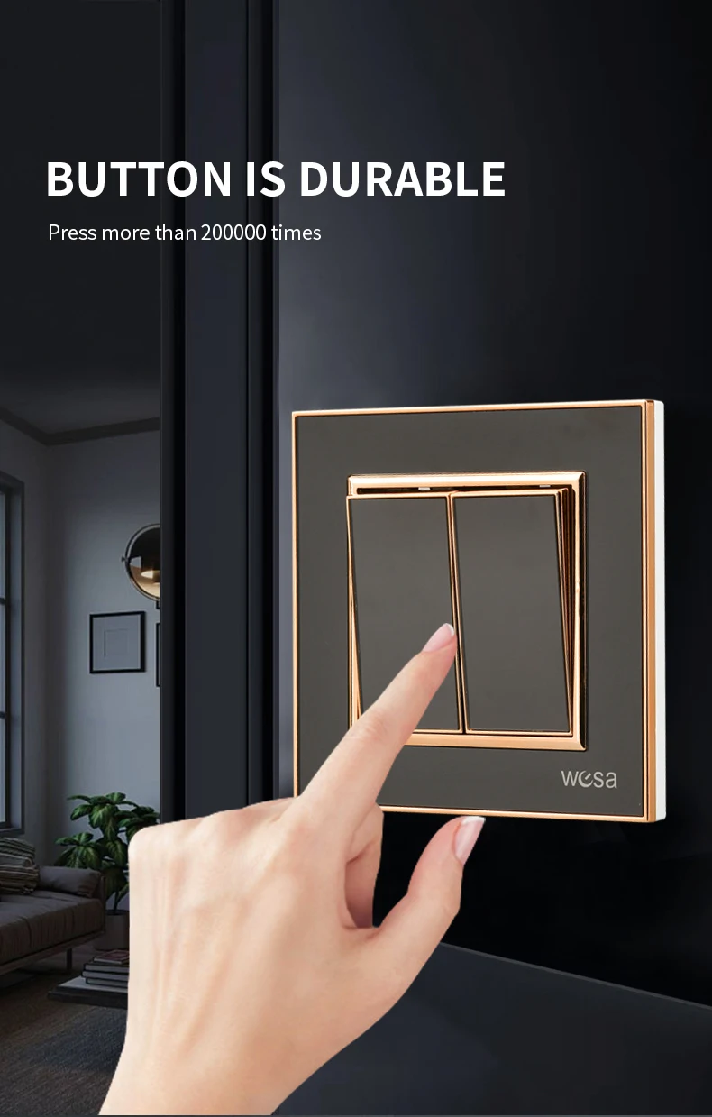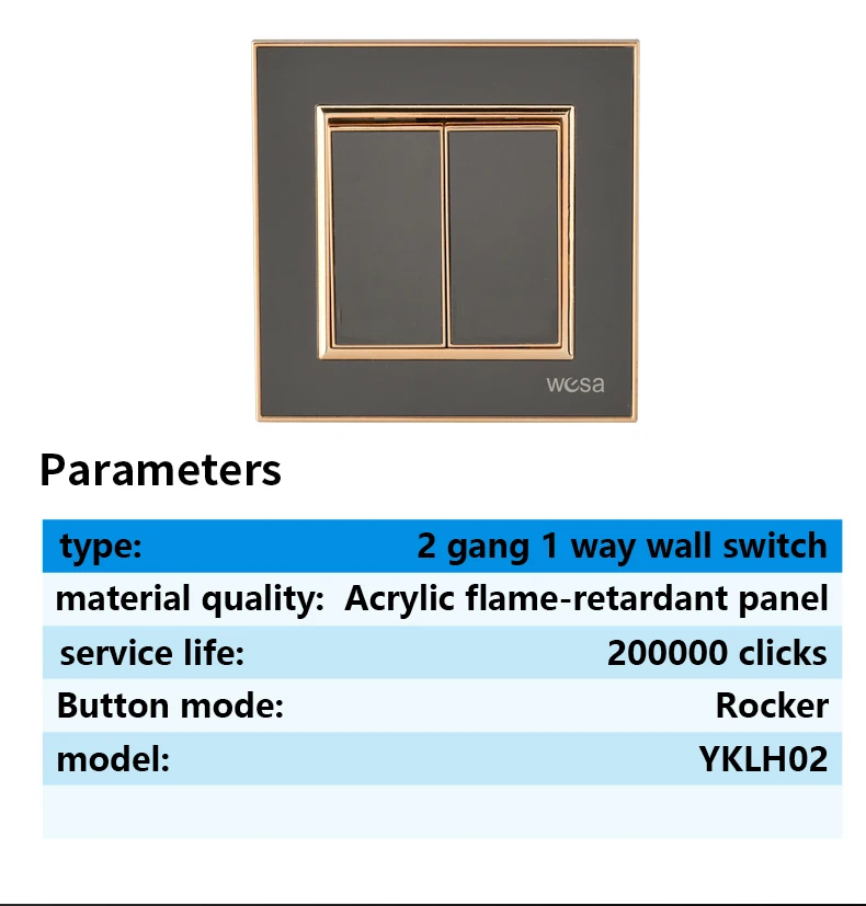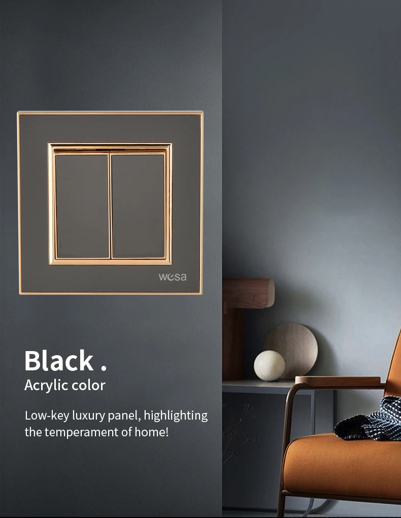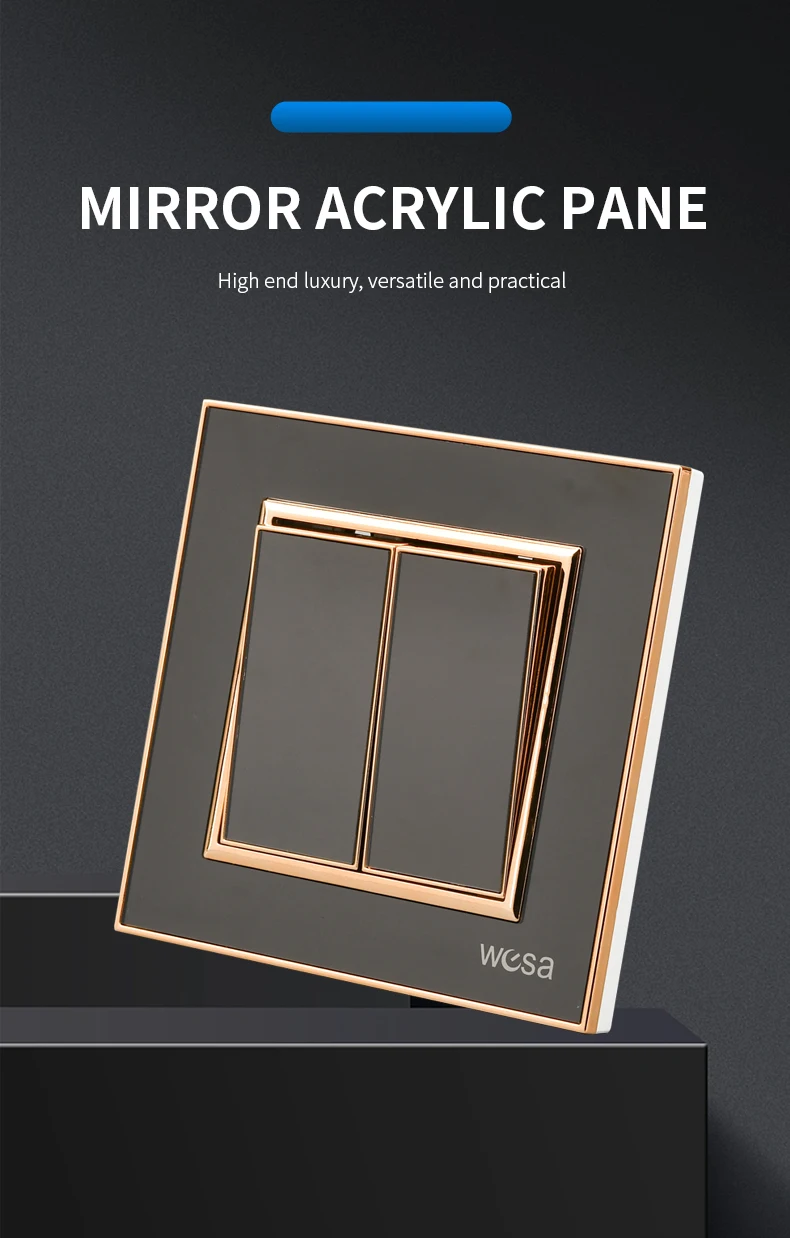 WESA Black Mirror Acrylic Wall Light Switch Flame retardant Panel Button 2 Gang 1 Way Wall Rocker Double Switch On/Off AC 250V